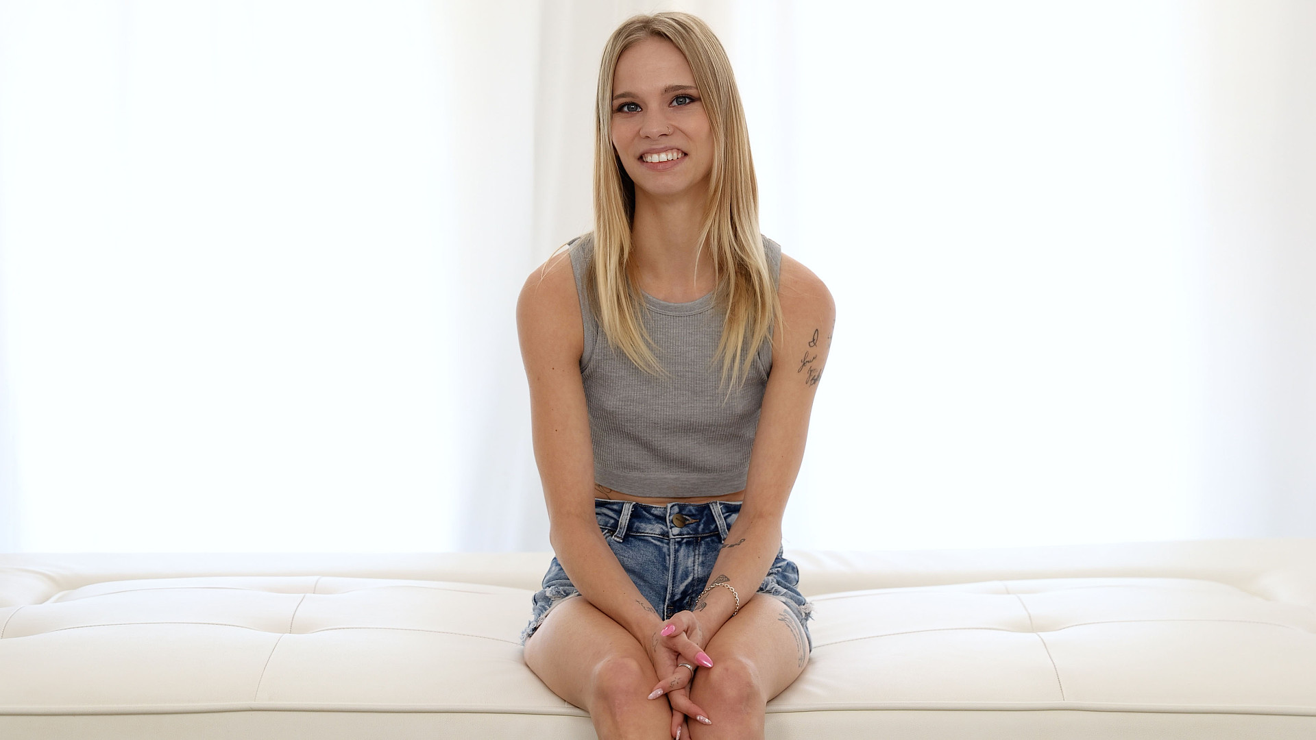 She steps in on a soft shuffle of [footsteps], looks to Tyler, and says she’s “here for Mike.” He checks her ID — “Do you have ID on you by chance?” — and she answers without fuss, “Um, I do.” The small talk opens up fast: she laughs easily, calls herself “just chill,” and mentions work that has her around a carnival. Tyler floats location ideas and she lights up at the reference: “It’s— it’s Malibu.” “You like Malibu, right?” “I do. I do.” He tells her, “I think you’re ready for the beach,” and she answers with a quick “Yeah,” breathing into the moment with those little [soft laugh]s that keep slipping out. They wander into music and she doesn’t hedge: “I like all kinds of music. I like country, but I like all music.” Tyler hints at a music arm they sometimes tap; asks whether she sings or plays. She doesn’t claim a specialty, but she stays game, nodding along while he sketches possibilities. The vibe stays easygoing and practical — a lot of listening, short answers, steady eye contact — the kind of give-and-take that makes “cute” the lane and keeps everything simple. Malibu stays in the air like a postcard, and the “ready for the beach” line keeps finding its echo as she settles in, comfortable with being looked at. They close with that plain, unforced cadence that suits her. Tyler says, “Seems like you had fun,” and she shrugs happy. He asks, “Would you come back if we wanted you to come back?” She doesn’t waver: “Yeah, for sure.” He checks her availability — “the next couple of weeks off?” — and she answers, “I do, I do.” So… will she?